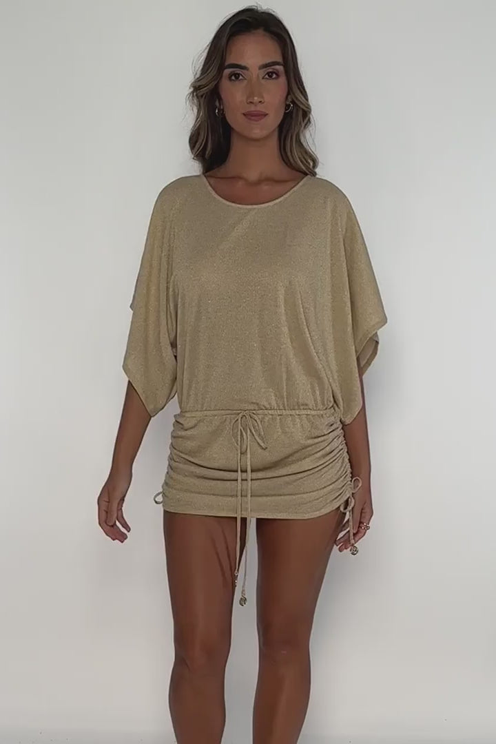 Designed to glow in the sun, the South Beach Dress in Gold Rush brings effortless beachside glamour with a subtle metallic finish. Featuring a relaxed oversized top and a softly form-fitting skirt, it creates an easy, flattering silhouette that drapes beautifully on the body. Adjustable side ties allow you to customise the length, while a drawstring at the hip adds gentle definition and movement. With its soft golden sheen and fluid feel, this is the perfect piece for poolside lounging, beach clubs, and warm evenings that call for a little extra sparkle