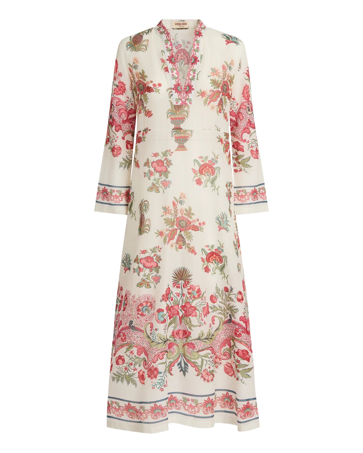 The Giada Kaftan is a cover-up silhouette . The red Chintz print draws from 17th-century Indian textiles, layering botanical motifs with rich depth and detail.