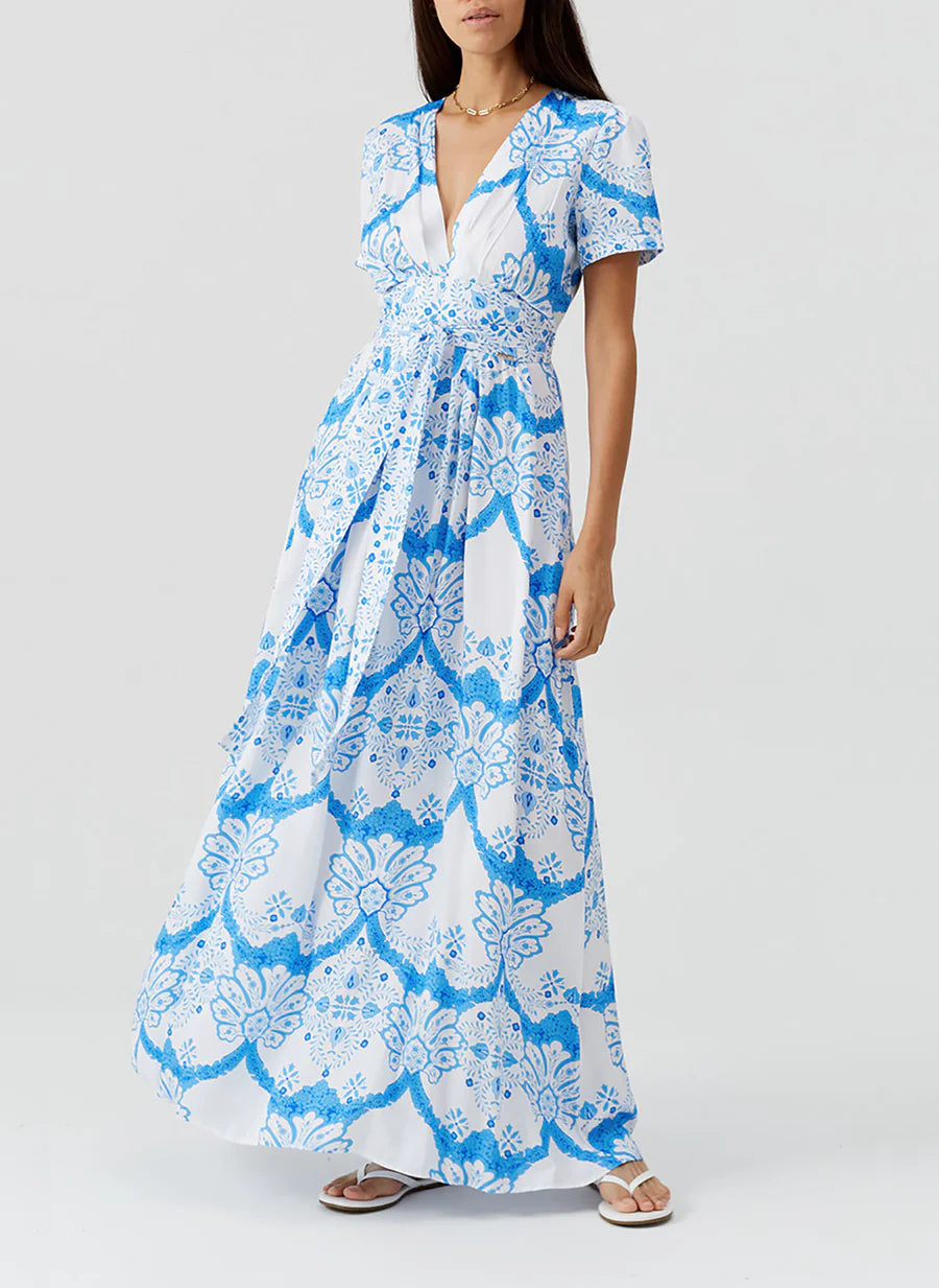 The Lou Dress in our botanical-inspired Florian print is an ode to effortless elegance. This maxi-length piece features a flattering low V-neckline and a fixed tie belt that cinches the waist, creating a fluid, feminine silhouette. Perfectly balancing relaxed ease with refined sophistication, it flows gracefully with every step.
