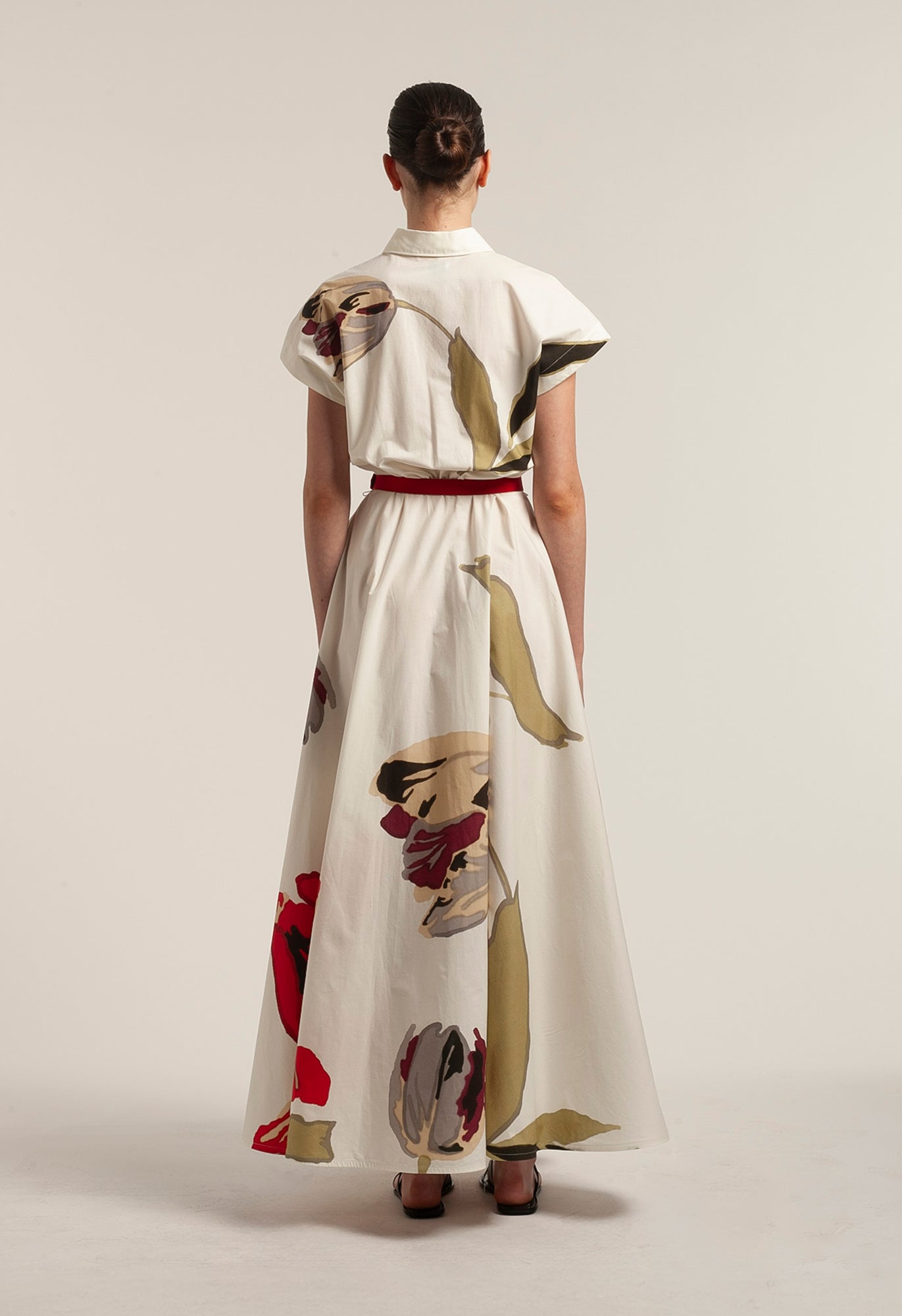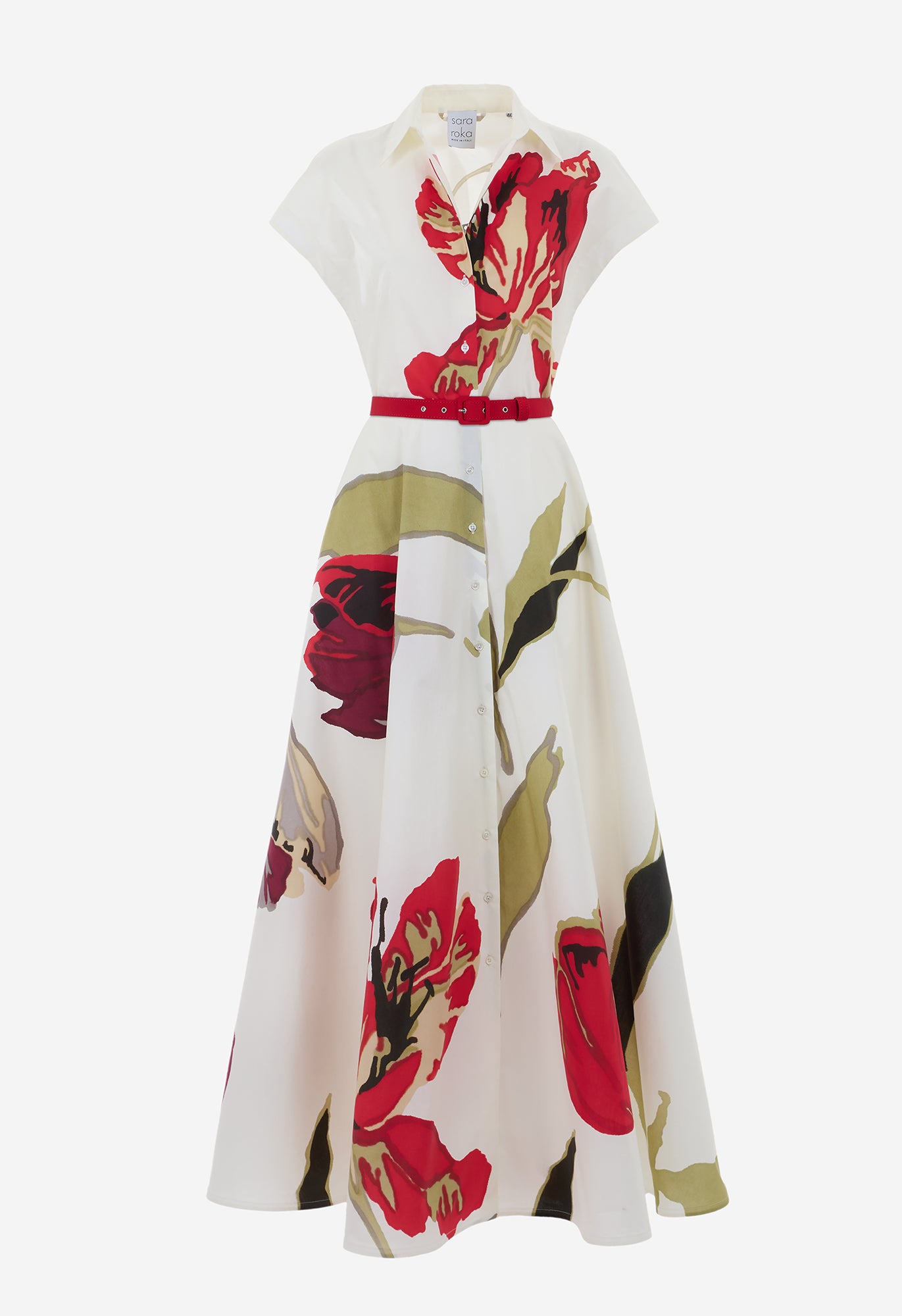 Inspired by sunlit Mediterranean gardens, this printed cotton poplin maxi shirtdress features a striking red tulip motif on a soft beige ground. Designed with cap sleeves, a flowing flared skirt and a signature grosgrain belt to define the waist, it offers effortless elegance for summer gatherings and refined resort escapes.