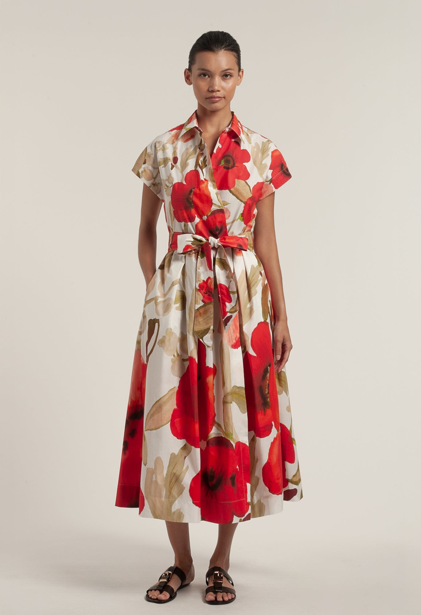 The striking poppy print in vibrant red with touches of green and black against a white ground brings a fresh, statement-making feel while remaining timelessly sophisticated. A self-tie belt in matching fabric gently defines the waist, allowing for a personalised fit.