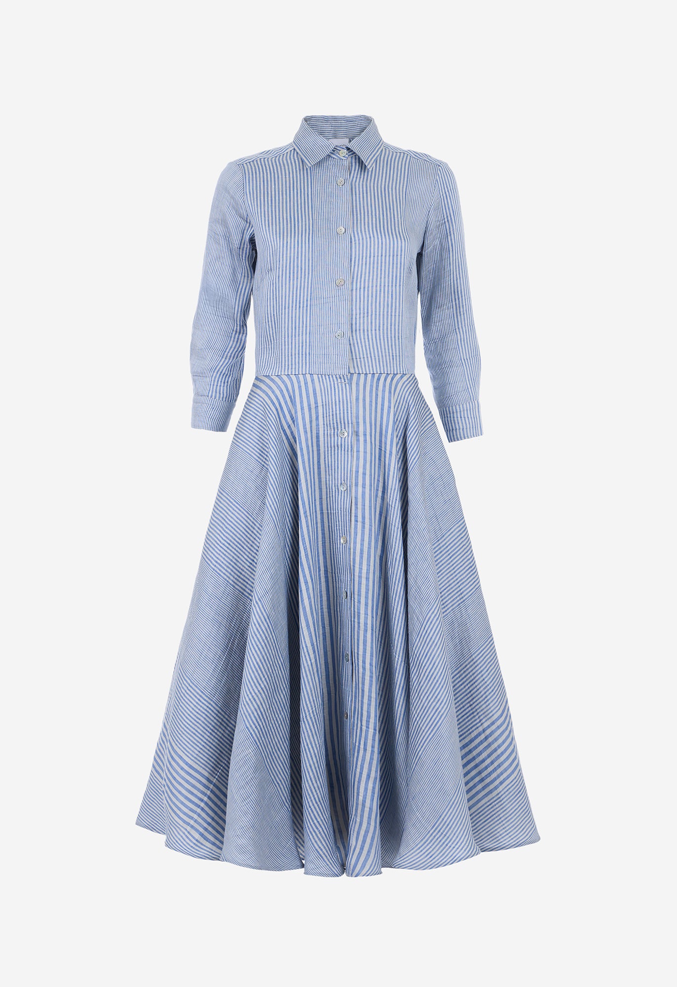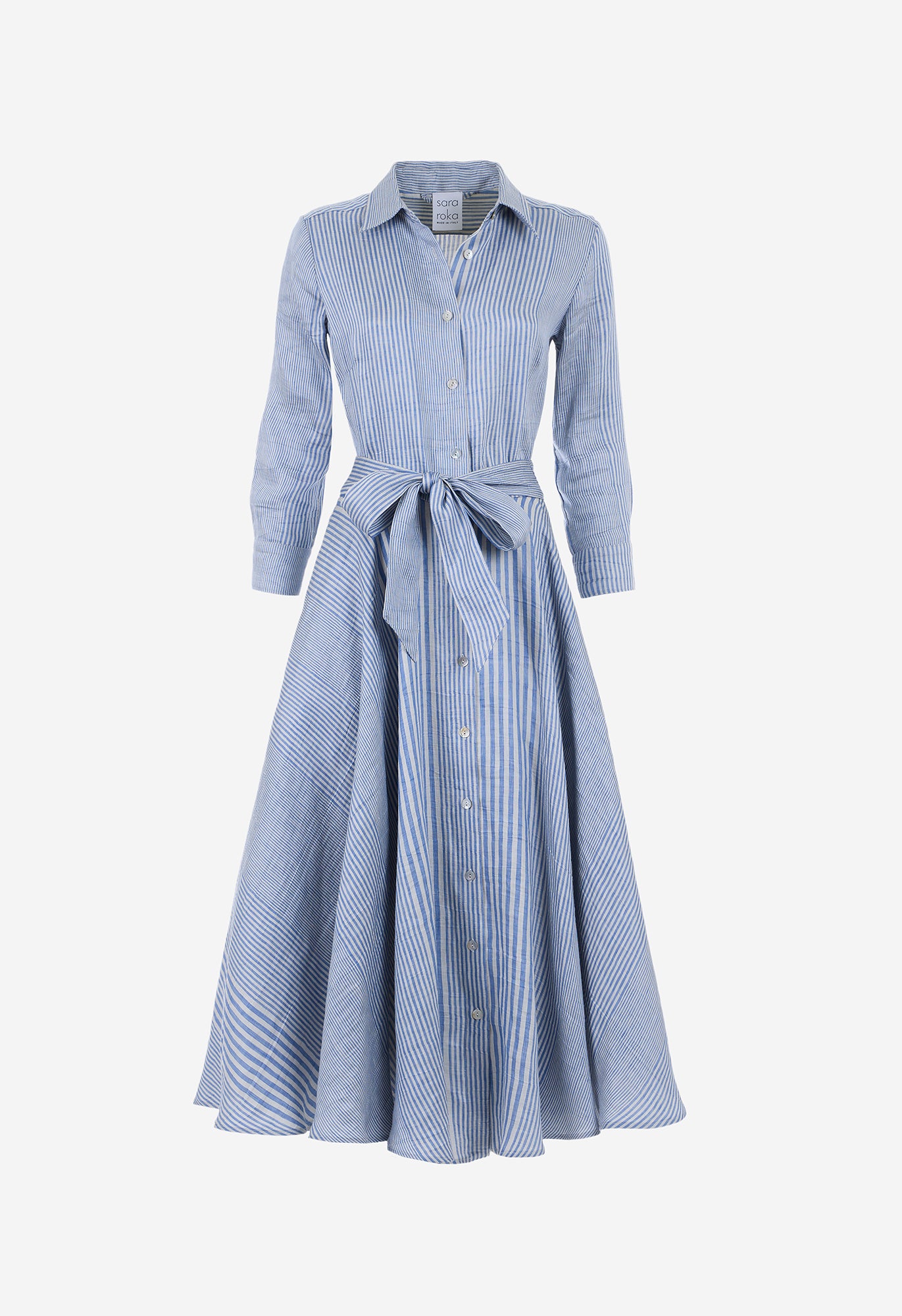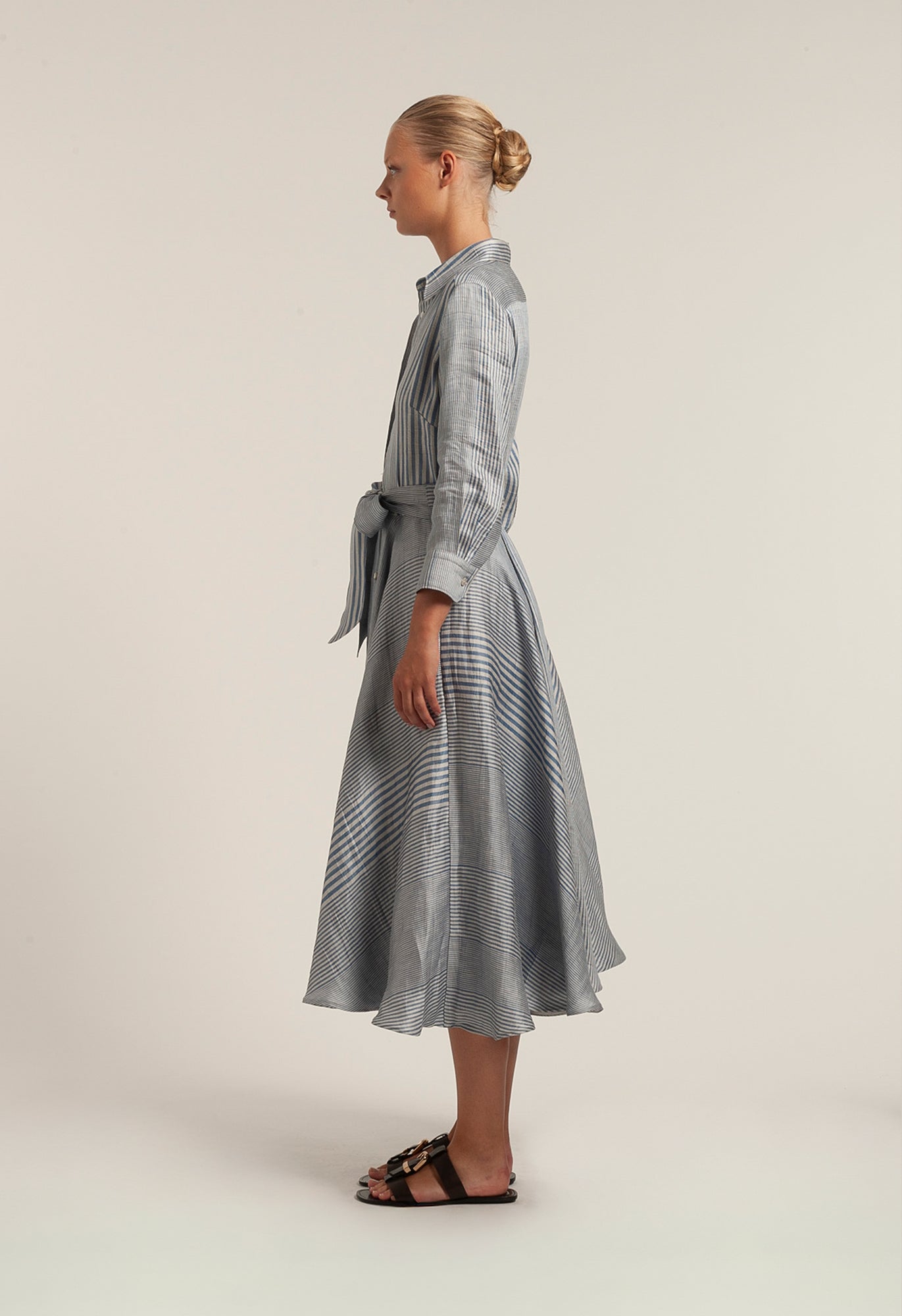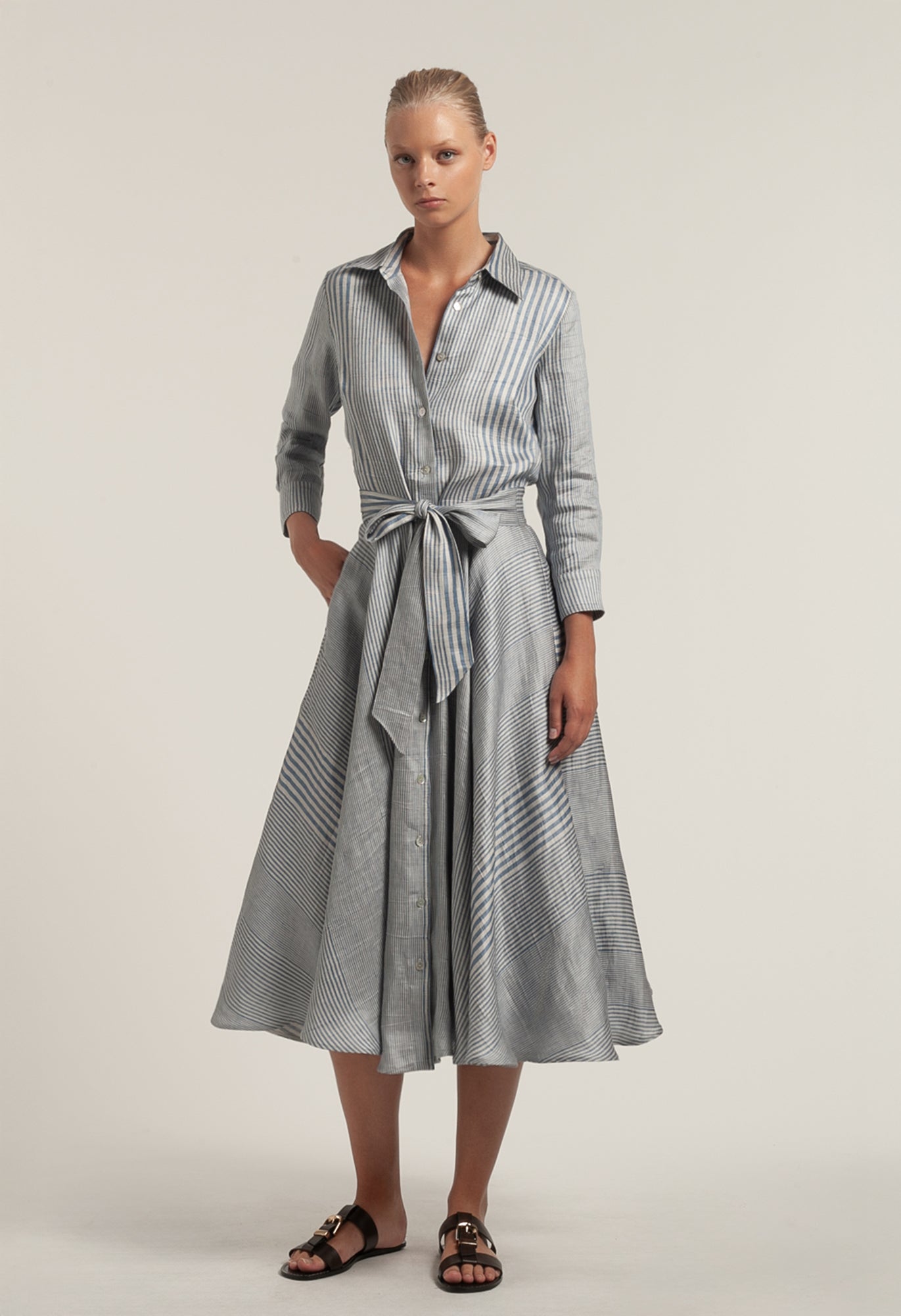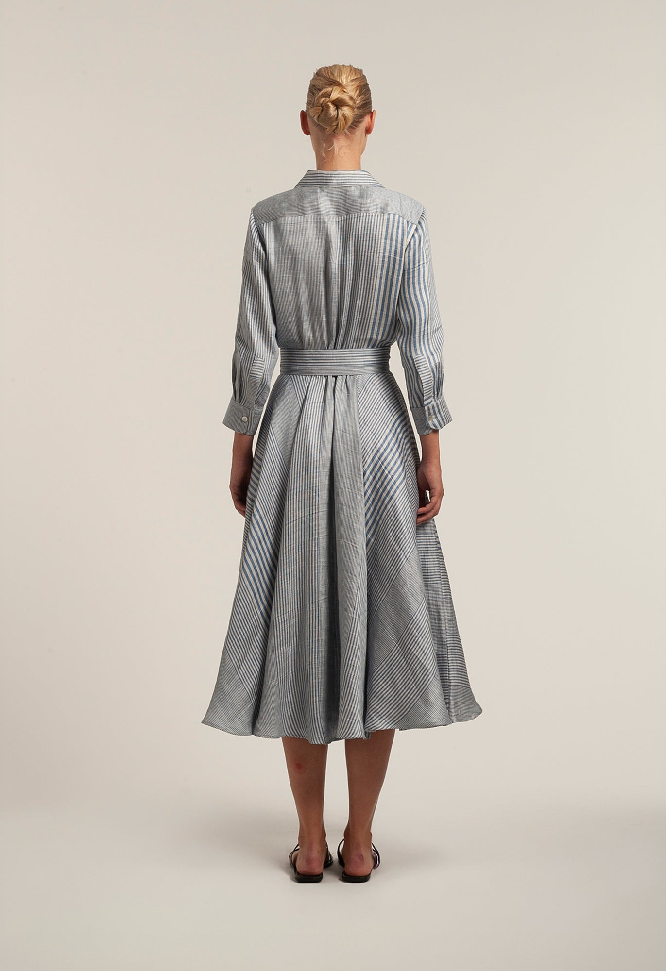 The delicate light blue stripe lends a fresh, sophisticated feel, while the fitted waist and self-tie belt create a flattering silhouette. Flowing into a full, graceful skirt, the design moves beautifully with every step, balancing crisp structure with feminine ease.