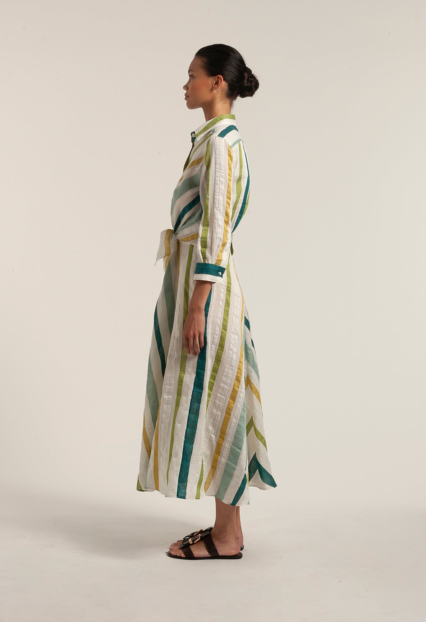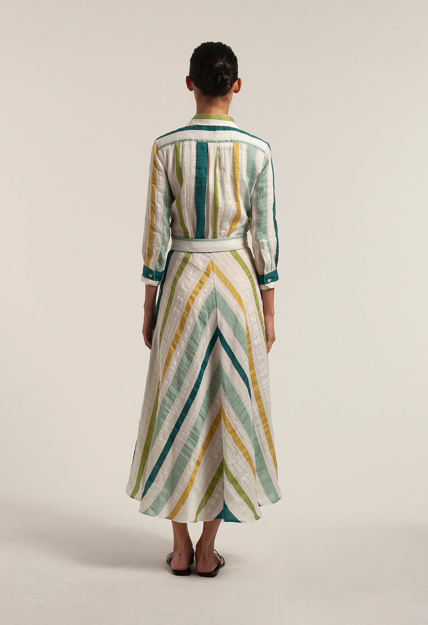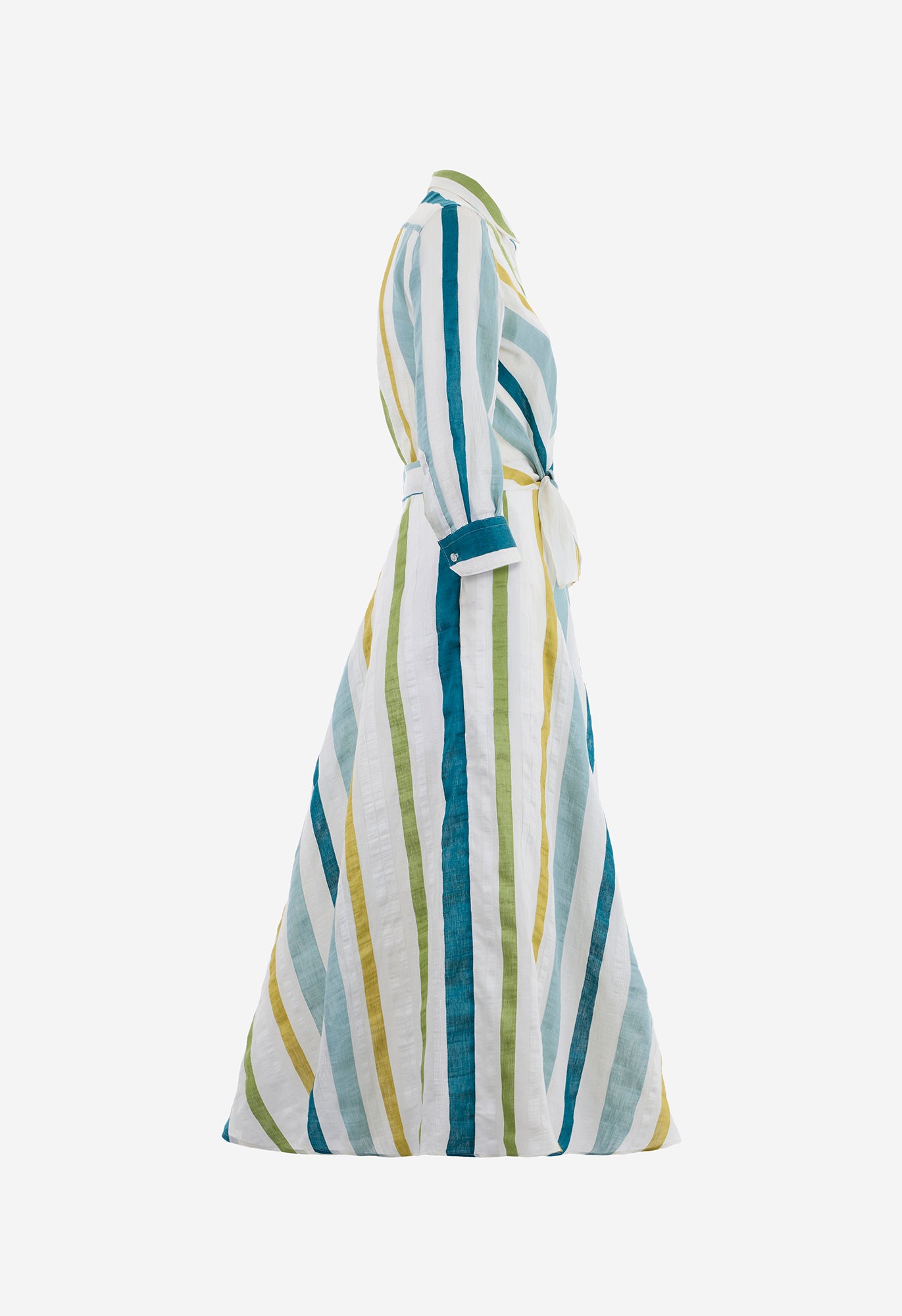 The striking multicolour stripe in lime, aqua, and teal against an off-white base brings a lively yet sophisticated feel, perfect for warm-weather dressing. A tie-front detail gently defines the waist, enhancing the feminine silhouette while maintaining an easy, relaxed elegance.