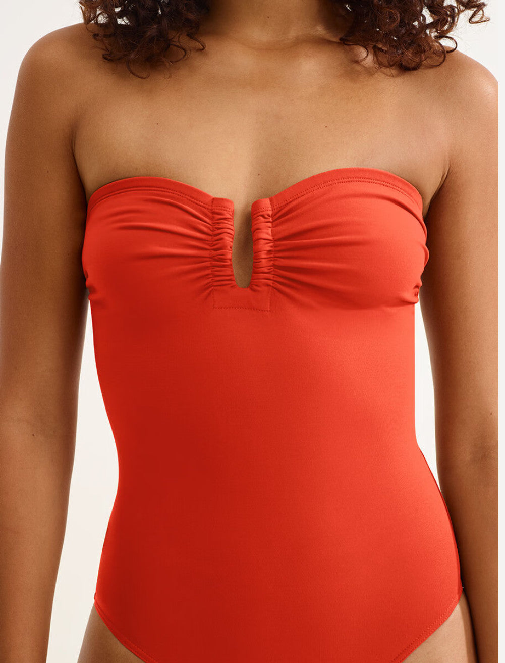 This iconic bustier one-piece, with gripper tape, can be recognised by its gathered cups separated by a U-shaped link. It enhances all body types.